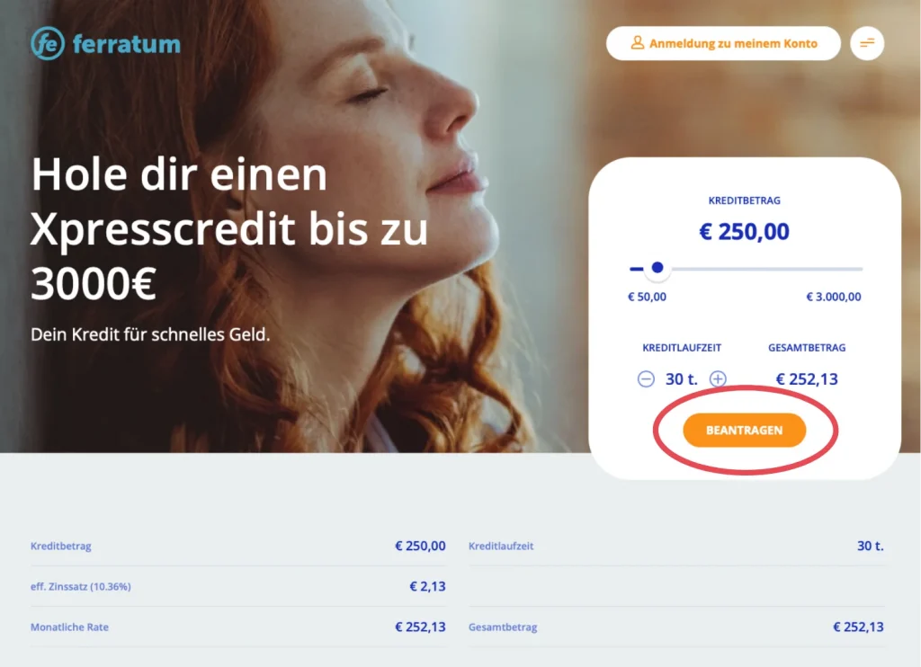 Schritt 1: Über die Homepage Ferratum.de* kannst du deine gewünschte Kredithöhe und Laufzeit in den Kreditrechner eintragen und mit “beantragen” einen Kredit anfragen.