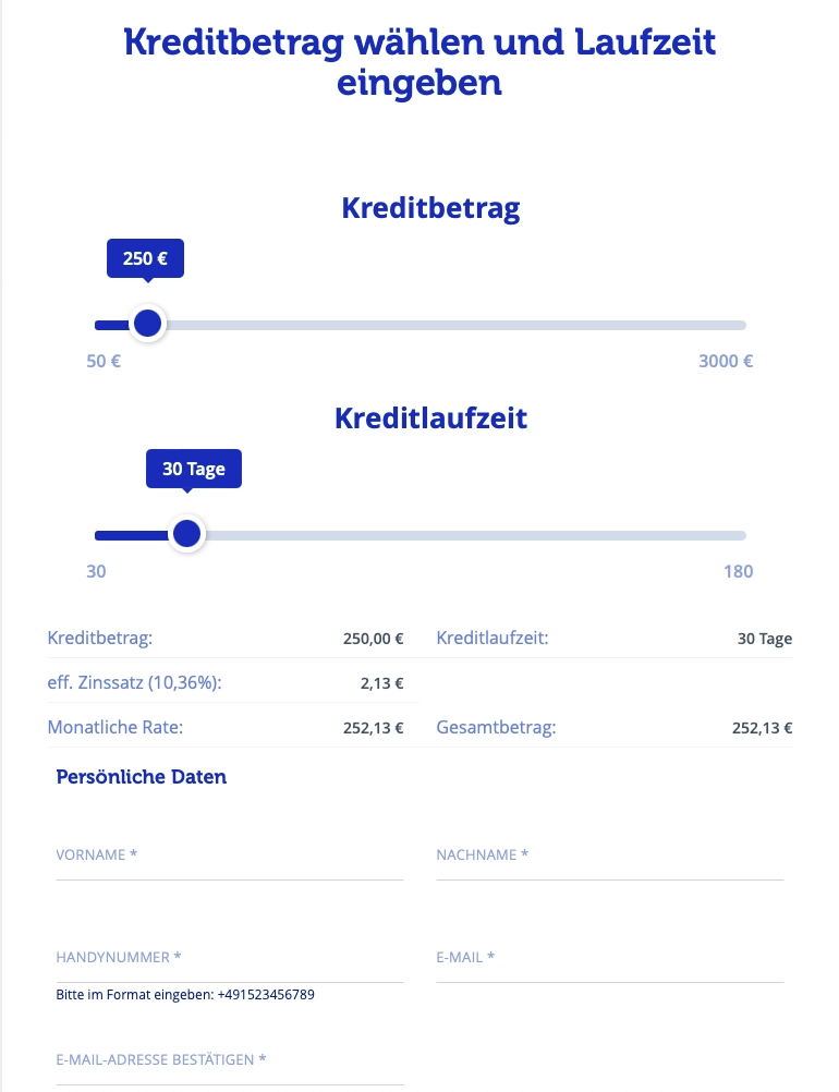 | Kreditbetrag | 50 € – 3.000 € |