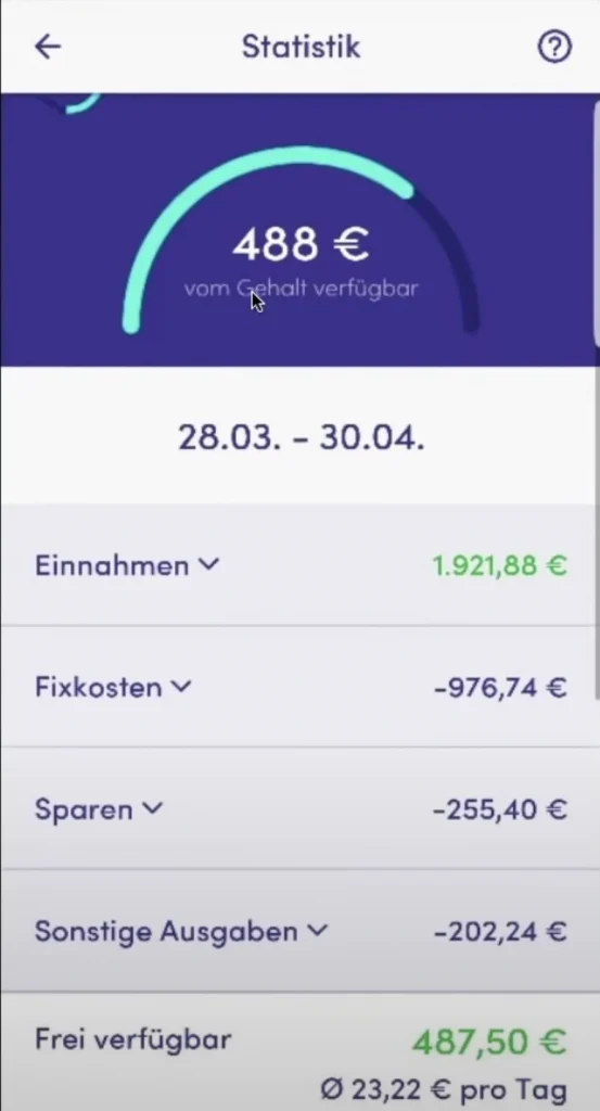 Man hat einer Übersicht über die Einnahmen und Ausgaben, die voneinander abgezogen werden. Daraus berechnet sich der frei verfügbare Betrag und daraus resultierend die maximalen Ausgaben, die pro Tag zur Verfügung stehen. In meinem Fall 23,22€.
