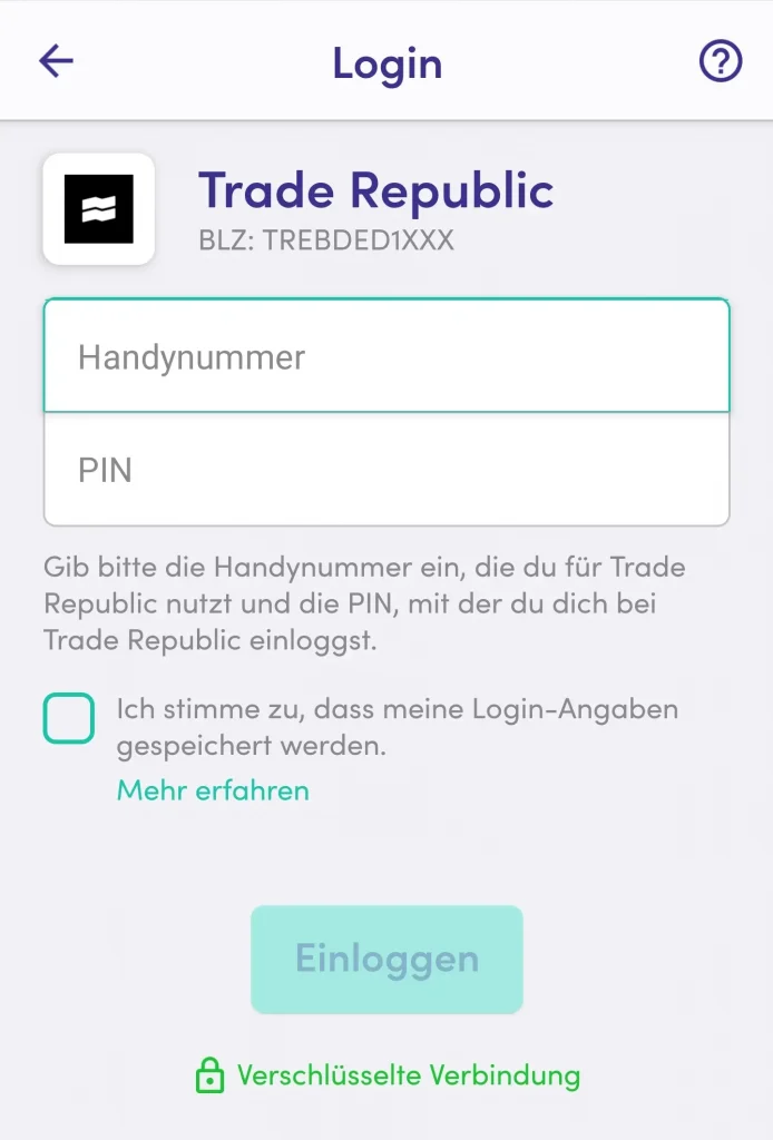 Jetzt kannst du Finanzguru mit Trade Republic verbinden, indem du deine Login-Daten für Trade Republic hinterlegst. Mehr zum Finanzguru Sicherheit findest du hier.