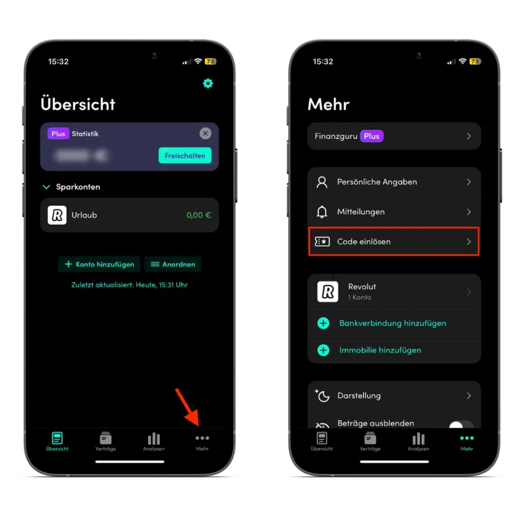Schritt 3: Nachdem du dich erfolgreich angemeldet hast, gehe unten in der App auf das Menü „Mehr“ und dann auf „Code einlösen“.