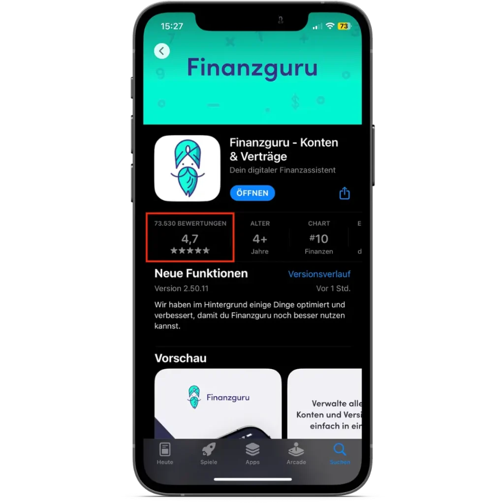 Die Finanzguru App hat über 74.000 Bewertungen im Appstore und wird mit sehr guten 4,7 Sternen bewertet. Die Nutzer der Finanzguru App sind also sehr zufrieden mit den Funktionen der App und Finanzguru gehört zu den am häufigsten heruntergeladenen Apps im Bereich Finanzen.