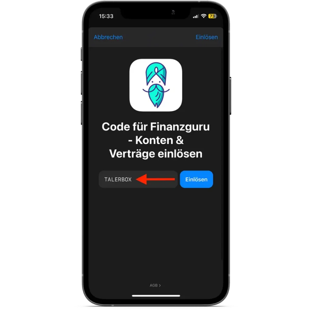 Schritt 4: Gib nun in das Gutscheinfeld den Finanzguru Code „TALERBOX3“ ein und klicke auf „Einlösen“.
