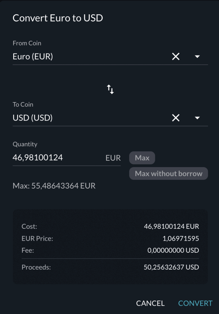 Da manche Handelspaare, wie z.B. Soland, Avax oder Cardano nur in US-Dollar gehandelt werden können, musst du vorher deine eingezahlten Euro in US-Dollar umwandeln.