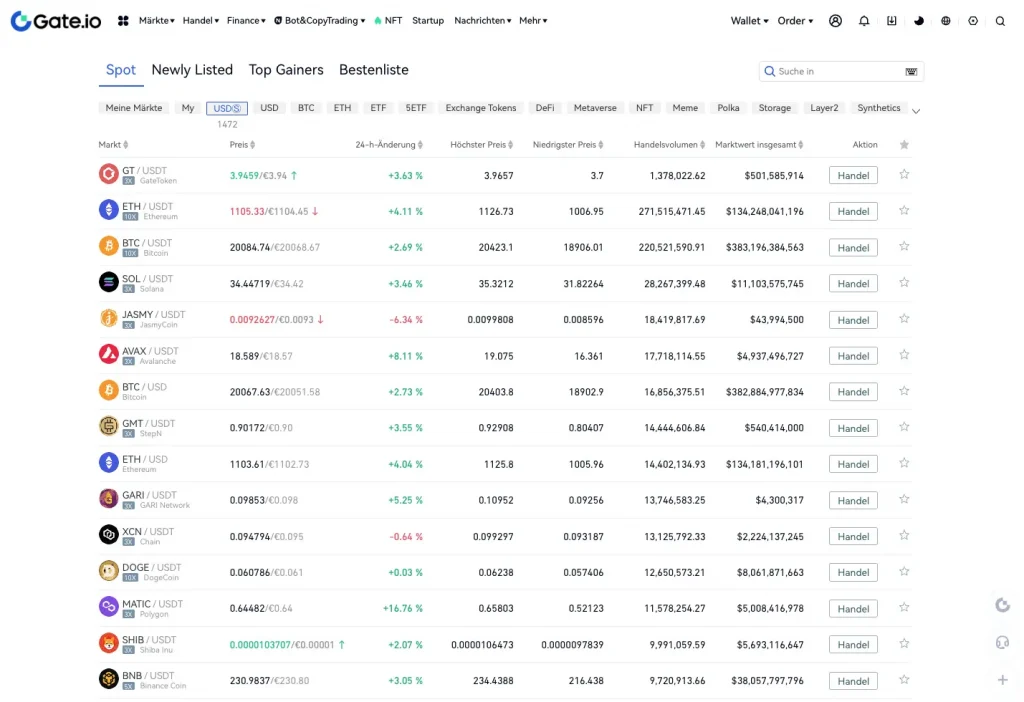 Deshalb gibt es bei der Auswahl der Coins auch keine Besonderheiten, die bei Gate.io hervorzuheben sind. Egal ob Klassiker wie Bitcoin, Ethereum, Binance BNB, Cardano ADA, Shiba Inu oder Doge Coin oder kleine unbekannte Low-Cap Coins. Alle sind bei Gate.io handelbar.