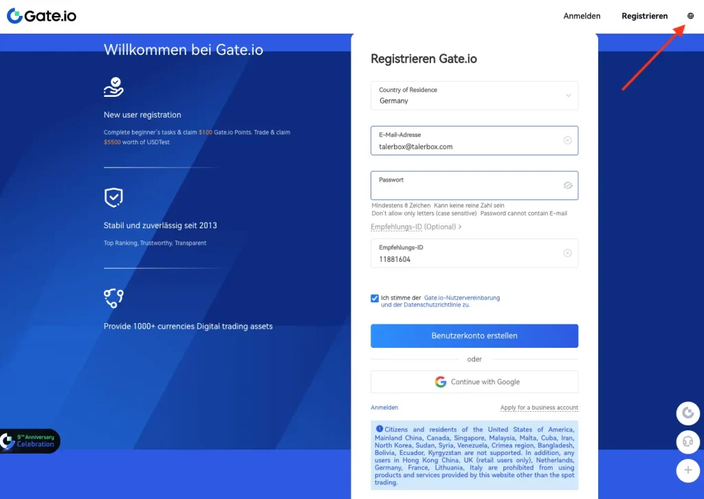 Bevor wir Gate.io nutzen können, müssen wir uns zunächst auf der Plattform registrieren und anmelden. Das geht innerhalb weniger Minuten per E-Mail und Passwort. Über das Globus-Symbol oben rechts kannst du zudem die Sprache direkt auf Deutsch umstellen.