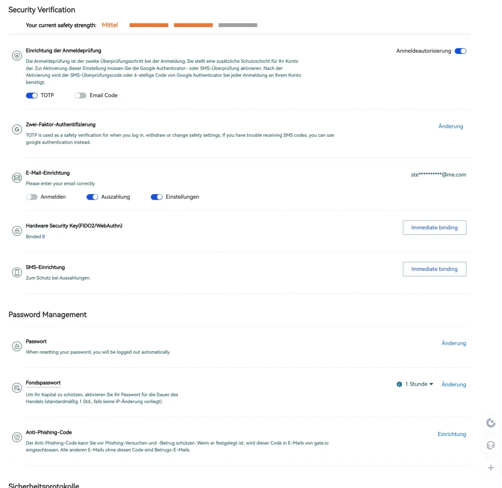 Gate.io ist eine der ältesten Krypto Börsen und wurde bereits 2013 gegründet. Zudem gehört Gate.io nach Handelsvolumen und Liquidität auch zu den größten Krypto Börsen und hat selbst in schwierigen Marktphasen keine Anzeichen von Problemen gezeigt. Gate.io bietet zudem viele Möglichkeiten, seinen Account vor Fremdzugriff zu schützen. Dazu zählen 2 Faktor Authentifizierung, IP Bindung, Trading Passwort, Phishing Passwort u.v.m. Das sind viele Punkte die für die Sicherheit von Gate.io sprechen. Wir empfehlen aber grundsätzlich nicht mehr von deinen Kryptowährungen als notwendig auf einer Börse zu lassen und diese stattdessen mit einem Hardware-Wallet zu sichern.