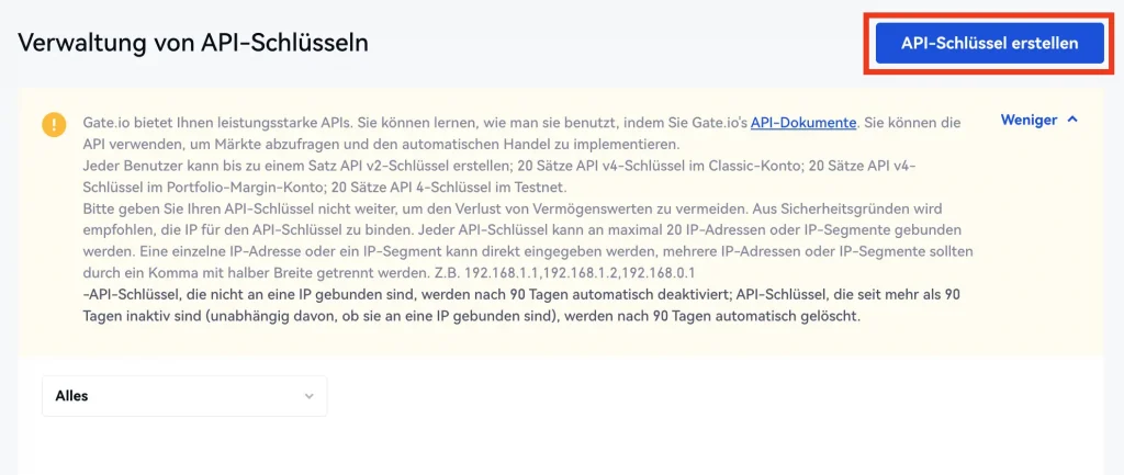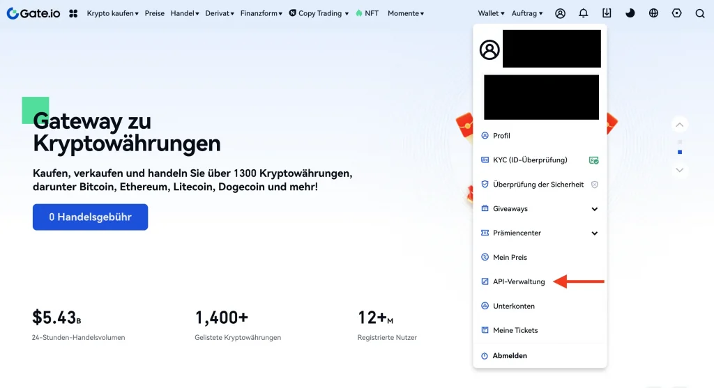 Schritt 1: In deinem Gate.io Account findest du unter deinem Profil > API Verwaltung die Möglichkeit, einen API Schlüssel zu erstellen.
