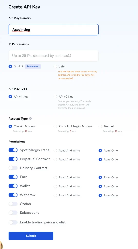 Schritt 3: Nun kann der API Schlüssel erstellt werden. Dazu kannst du einen beliebigen API-Namen vergeben. Handelsrechte sind für den Import in ein Krypto Steuer-Tool wie Cointracking nicht notwendig und sollten nicht aktiviert werden. Es reicht die entsprechenden Punkte auf „Read Only“ zu stellen.