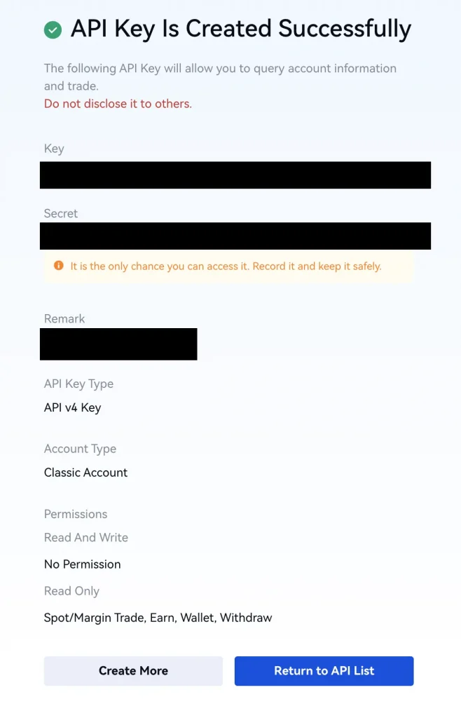 Schritt 4: Danach ist der API Schlüssel für Gate.io erstellt. Du kannst den API Schlüssel und das API Geheimnis jetzt in ein Krypto Steuer-Tool wie Cointracking importieren, um alle Transaktionen automatisch zu importieren.