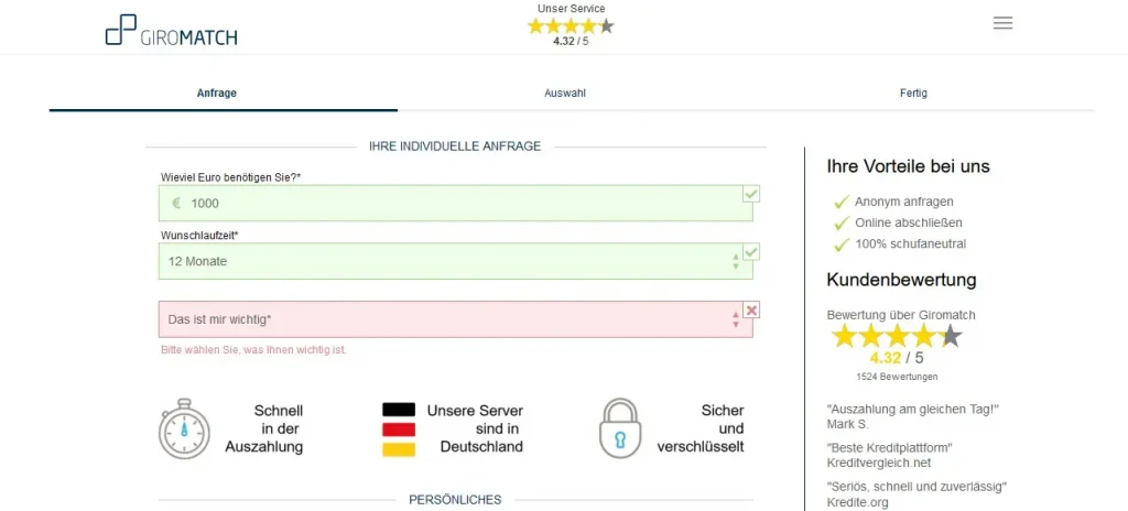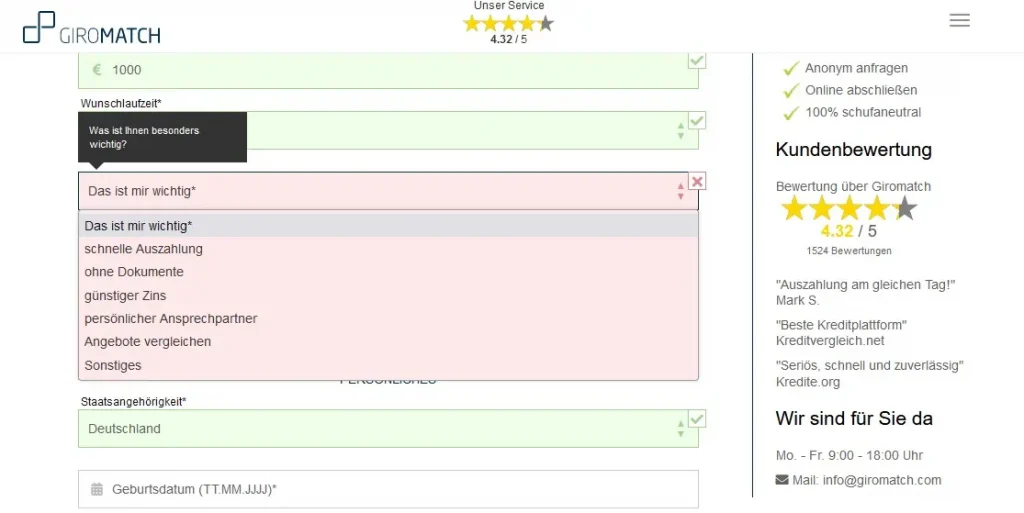 Zudem hast du hier die Möglichkeit, auszuwählen, was dir bei deinem Kredit besonders wichtig ist. Dies können beispielsweise eine besonders schnelle Auszahlung, ein günstiger Zins oder ein Kredit ohne erforderliche Dokumente sein. Anhand deiner Anforderungen versucht Giromatch einen passenden Kredit für dich zu vermitteln.