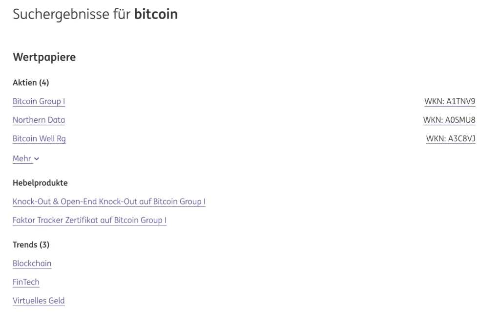 Schon die Suche nach Kryptowährungen zeigt sich bei der ING Bank als schwierig. Denn sucht man nach Bitcoin, wird man hier nicht wirklich fündig. Erst bei einer genaueren Suche stößt man auf sogenannte Krypto-ETPs. Das kann allerdings schnell zu Verwirrung führen und hinterlässt keinen positiven Eindruck.