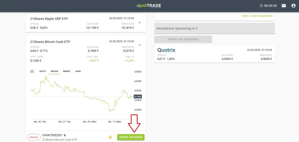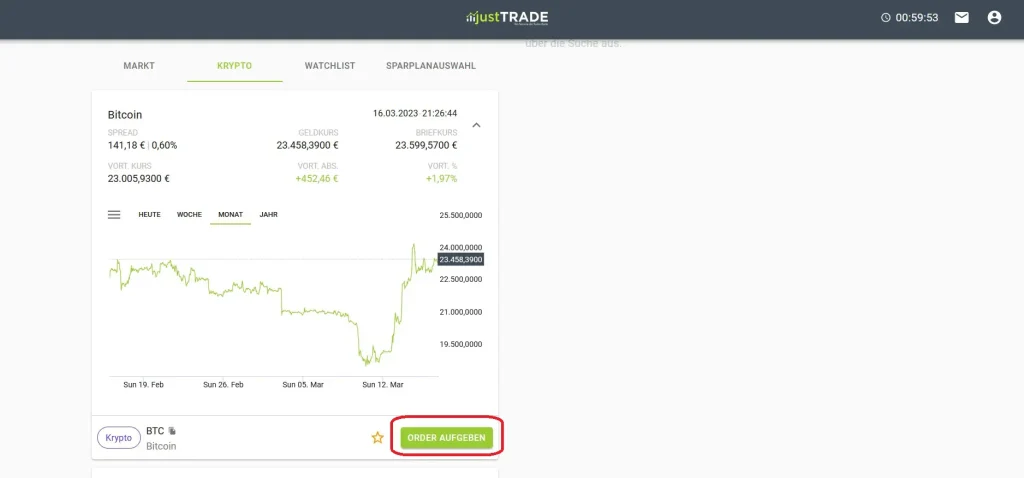 Über justTrade Krypto zu handeln funktioniert genauso wie der Handel mit Wertpapieren. Hast du dich für einen Coin entschieden, klickst du einfach auf “Order aufgeben”.