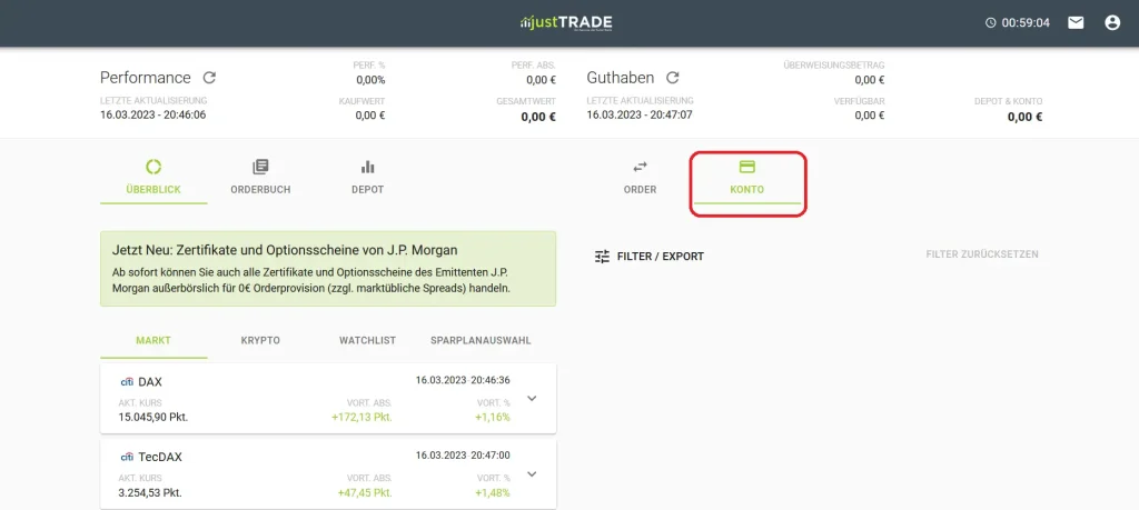Klicke einfach im Dashboard auf “Konto”, um die IBAN deines justTRADE-Kontos anzuzeigen. Unter “Konto” kannst du dir auch Geld von deinem justTRADE-Konto auf dein Verrechnungskonto auszahlen lassen.