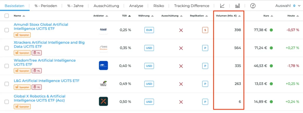 Mit Ausnahme des ETFs von Global X liegen alle anderen KI ETFs über einem Fondsvolumen von 100 Mio. EUR. Zudem ist der Global X erst vor kurzem aufgelegt worden und mit einer Gesamtkostenquote von 0,5 Prozent auch noch der teuerste verfügbare ETF. Daher würden wir diesen ETF für ein mögliches KI-Investment grundsätzlich ausschließen.