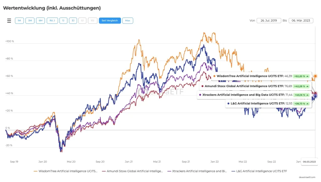 Ein Performancevergleich der jüngeren Vergangenheit zwischen den verbleibenden 4 KI ETFs zeigt, dass der WisdomTree Artificial Intelligence ETF (WKN: A2N7KX) bisher die beste Performance erzielt hat. Die Wertentwicklung in der Vergangenheit ist jedoch kein Indikator für die zukünftige Wertentwicklung und eine weitere Outperformance ist nicht garantiert. Die Performance auf kurze Zeiträume sollte daher nicht die alleinige Entscheidungsgrundlage sein.