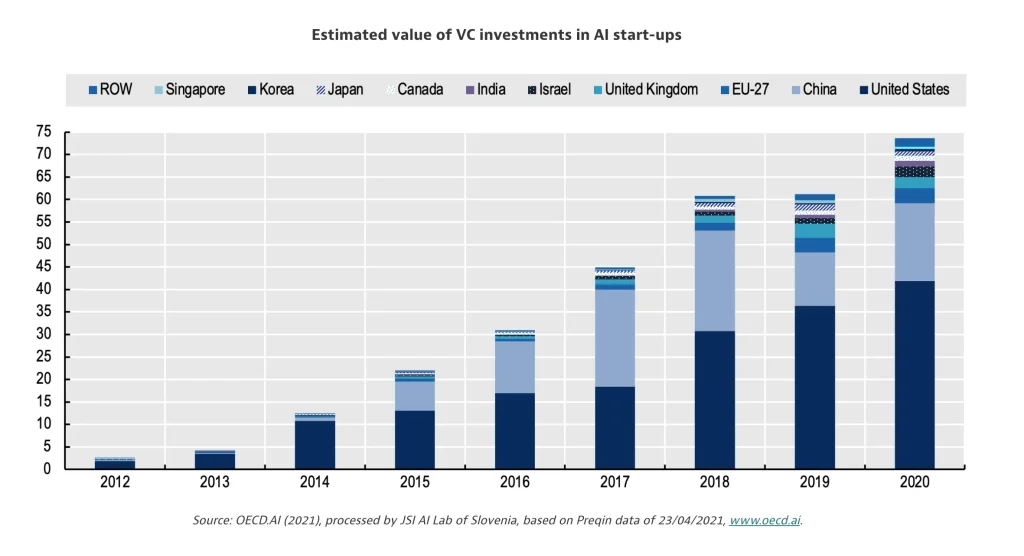 In vielen Anwendungsfällen ist der Einsatz von KI nicht immer sofort erkennbar, aber der Nutzen von KI liegt in der Regel in der Fähigkeit, große Datensätze zu verarbeiten und darin Muster zu erkennen. Das Thema ist jedoch nicht so neu, wie es auf den ersten Blick scheint. Bereits seit 2012 investieren VCs vermehrt in KI-Start-Ups und die Investitionen stiegen seitdem kontinuierlich an.