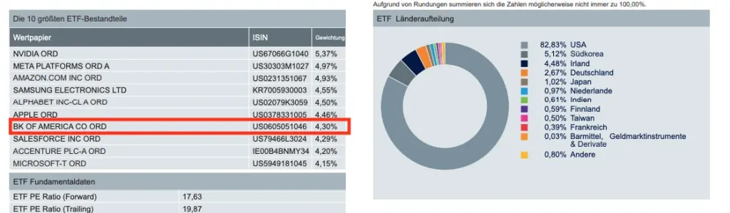 Schau dir bei Themen-ETFs immer den zugrundeliegenden Index genau an. Oft spiegelt der Index nicht unbedingt das wider, was du erwartest. Im KI ETF von Xtrackers ist zum Beispiel die “Bank of America” unter den ersten 10 Positionen. Es ist möglich, dass die Bank of America Anstrengungen im Bereich der künstlichen Intelligenz unternimmt, aber es ist kein Unternehmen, das man grundsätzlich als KI-Investition bezeichnen oder erwarten würde.