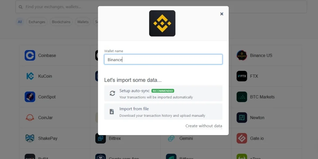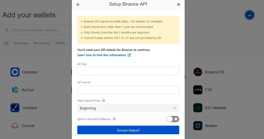 Der genaue Ablauf variiert je nach gewähltem Anbieter. Bei BitPanda benötigst du zum Beispiel nur den API-Schlüssel. Bei Binance werden ein API-Schlüssel und ein API-Secret benötigt. Beim Datenimport von Coinbase wirst du direkt zu deinem Coinbase-Konto weitergeleitet. Eine ausführliche Anleitung zu Coinbase findest du auch in unserem Artikel Coinbase Steuern.