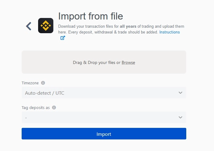 Schritt 3: Möchtest du die Transaktionshistorie manuell per Datei hinzufügen, kannst du dies einfach per Drag & Drop tun. Alternativ kannst du nach der CSV-Datei browsen. Falls die CSV-Datei deiner Börse keine Angabe der Zeitzone enthält, kannst du diese hier nachträglich festlegen.