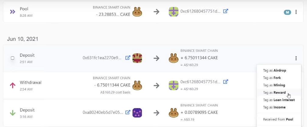Schickst du beispielsweise Token über Ethereum oder die Binance Smart Chain zu einem Staking Pool, markierst du diese Transaktion als “Sent to Pool”. Erhältst du Staking-Rewards, kannst du diese bei Koinly unter der Rubrik “Reward” taggen.