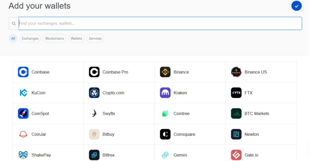 Du kannst zu jedem Zeitpunkt weitere Wallets / Krypto-Börsen zu Koinly hinzufügen. Hierfür klickst du einfach in der Wallet-Übersicht auf den blauen Knopf “+ Add wallet / exchange”. Du gelangst zur Übersicht aller verfügbaren Wallets und gehst auf die oben beschriebene Weise vor.