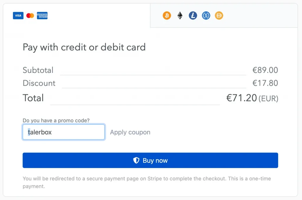 - Im Bestellformular für den gewählten Krypto-Steuer Plan wirst du nun gefragt, ob du einen Promo-Code hast. Hier kannst du den Code “talerbox” eingeben und bekommst anschließend 20% Rabatt auf den regulären Preis. (Gilt auch für zukünftige Steuererklärungen bzw. Bestandskunden)