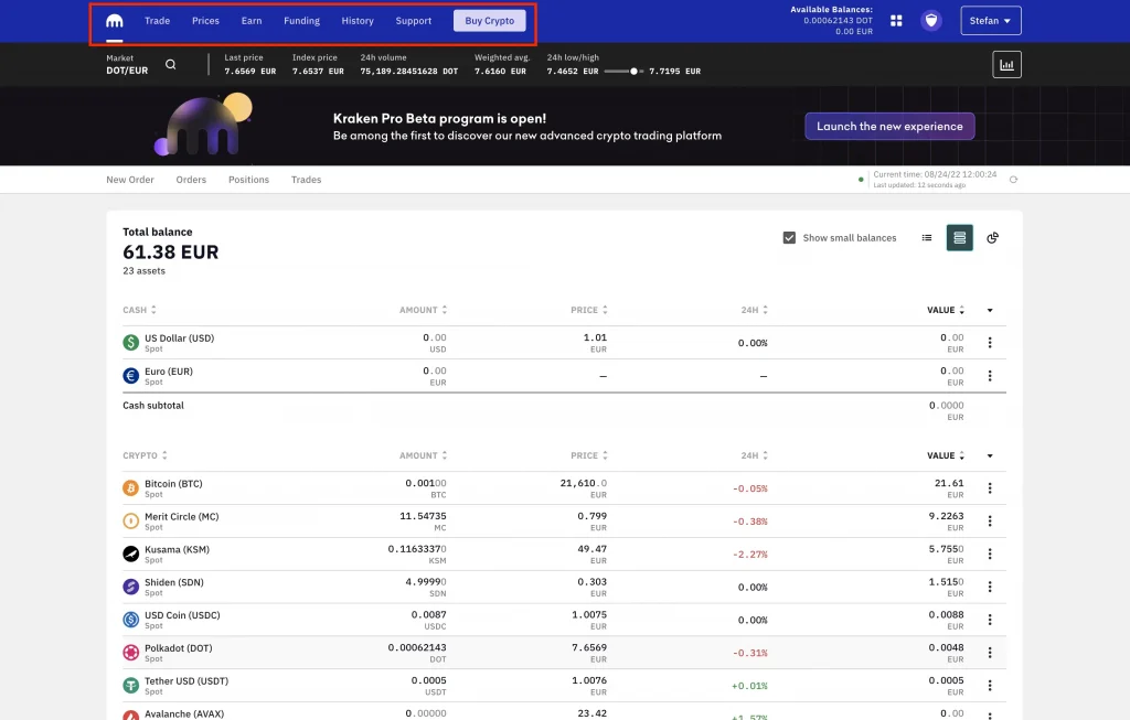 Über das Kraken-Symbol im Menü gelangst du zum Dashboard, das dir eine detaillierte Übersicht deines Kontostandes inklusive aller Kryptowährungen bietet. Hier siehst du auf einen Blick, in welche Coins du investiert hast, wo der Kurs deiner Coins aktuell steht und wie sich dieser in den letzten 24 Stunden verändert hat.