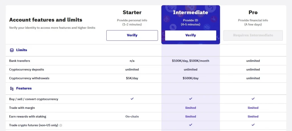 Schritt 2: Verifizierungsstufe auswählen: Starter, Intermediate oder Pro. Je nach Verifizierungsstufe werden die Limits des Accounts hochgestuft.
