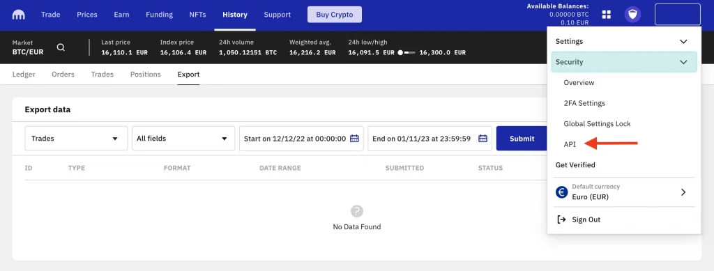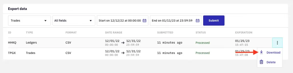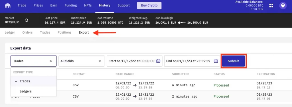 Schritt 2: Klicke im Untermenü nun zunächst auf “Export”. Wähle anschließend unter Export Type “Trades” oder “Ledgers” (für die Steuer sollten beide CSVs erstellt werden) und den Zeitraum, für den die CSV erstellt werden soll. Wenn das dein erster Export für die Steuererfassung ist, empfehle ich den Zeitraum seit deiner Kontoeröffnung einzustellen.