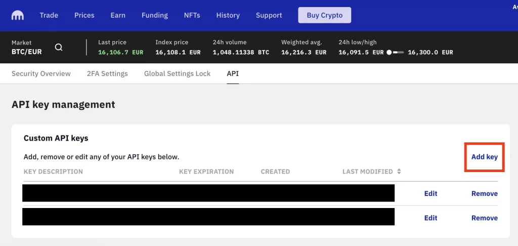 Schritt 2: Nun bist du im “API Key Management” Menü . Hier werden dir bereits erstellte API Keys angezeigt und du kannst sie verwalten. Über “Add key” kannst du einen neuen API Key erstellen.