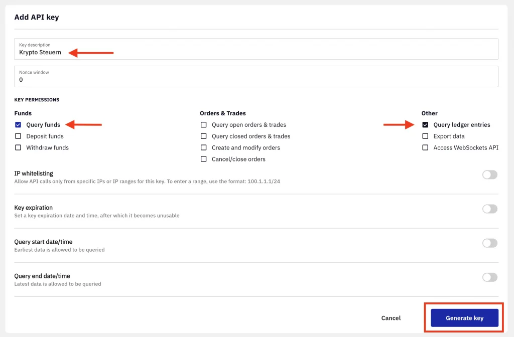 Schritt 3: Nun musst du zunächst einstellen, welche Zugriffe der API Key bekommen soll. Für die Erfassung der Steuer sind Rechte für “Query Funds” und “Query Ledger entries” ausreichen. Zudem kannst du einen beliebigen Namen für den API-Schlüssel vergeben. Ich empfehle hier den Verwendungszweck als Namen zu vergeben, also beispielsweise das Krypto-Steuer Tool, für das der API Schlüssel genutzt werden soll. Ich würde dir zudem für das einfachere Management empfehlen, für jedes Tool einen eigenen API-Schlüssel anzulegen. Klicke anschließend auf “Generate Key”.