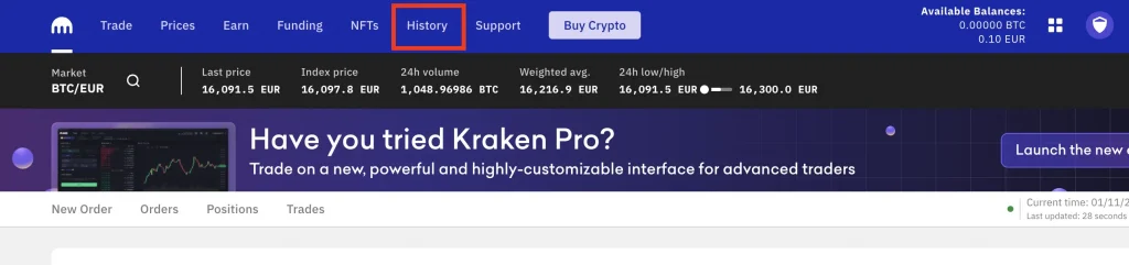Schritt 1: Log dich bei Kraken ein und gehe oben im Reiter auf “History”.