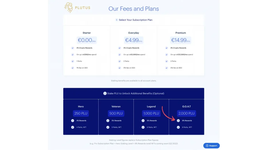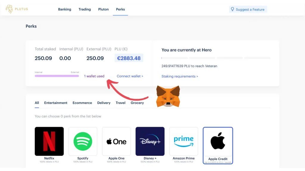 Erfreulich ist zudem, dass bereits mit der kostenlosen Plutus Karte und ohne Staking des Pluton Token 3% Cashback und 1 Perk/Gratis-Abo deiner Wahl (kostenlos in den ersten 3 Monaten) möglich ist. Damit kann die Karte völlig ohne Risiko vorab getestet und mit dem Cashback sammeln begonnen werden. Eine Besonderheit ist zusätzlich bei Plutus, dass das optionale Staking des Pluton Token über deine eigene Wallet erfolgen kann. (kein „Muss“)