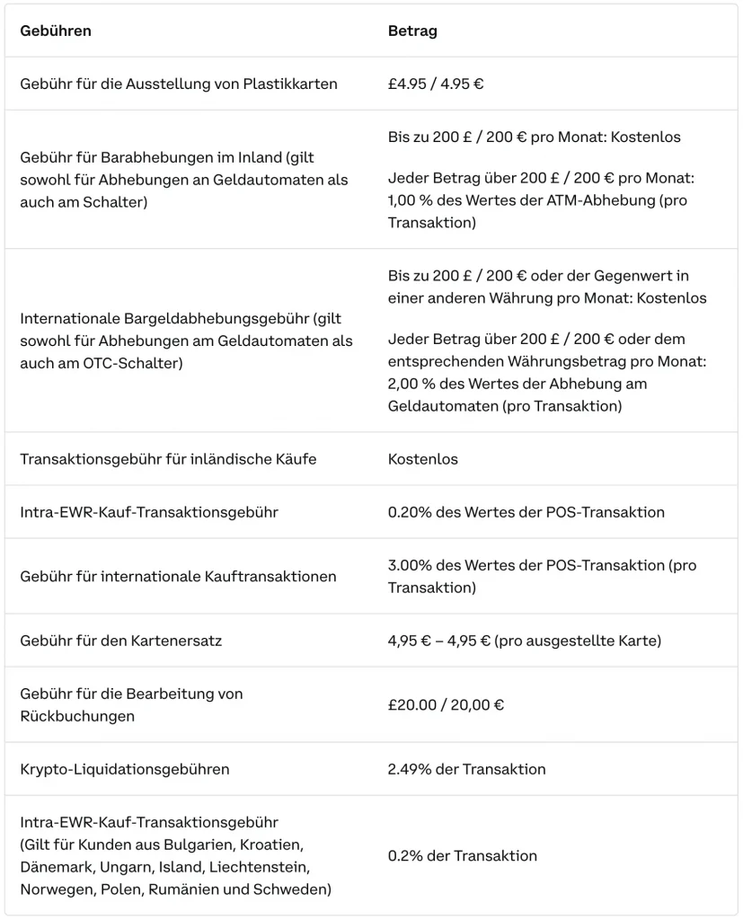 Einige Anbieter wie z.B. Revolut bieten neben der kostenlosen Variante ihrer Karten, auch Varianten mit monatlichen Gebühren an. Die Gebühren liegen bei den Anbietern in unserem Krypto Kreditkarten Vergleich zwischen 2,99€ und 29,99€. Für die Zahlung der monatlichen Gebühr erhältst du im Gegenzug zahlreiche Vorteile wie z.B. höheren Cashback und höhere Abhebelimits für Bargeldabhebungen am Geldautomaten.