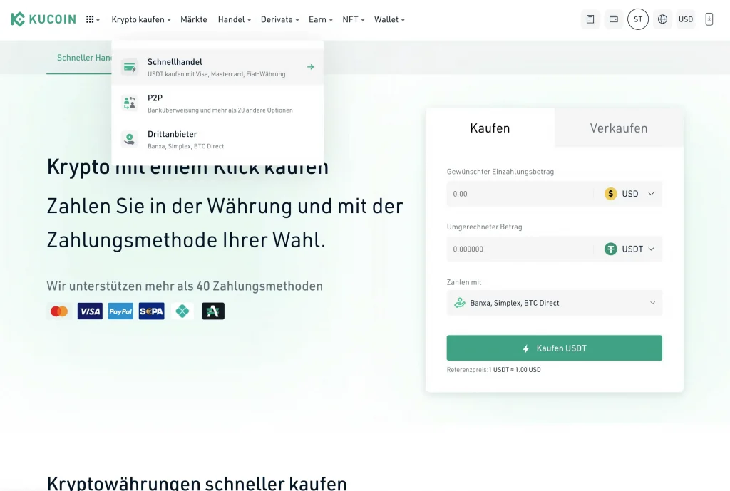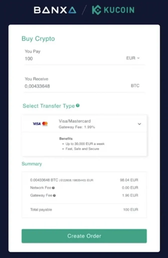 Möchtest du beispielsweise schnell mit Kreditkarte über den Service von Banxa kaufen, beläuft sich die Gebühr auf 1,99 %. Das ist zwar günstiger als der Kauf per Kreditkarte direkt über KuCoin, aber immer noch erheblich teurer als eine Banküberweisung mit anschließendem Kauf per Spot Trading.