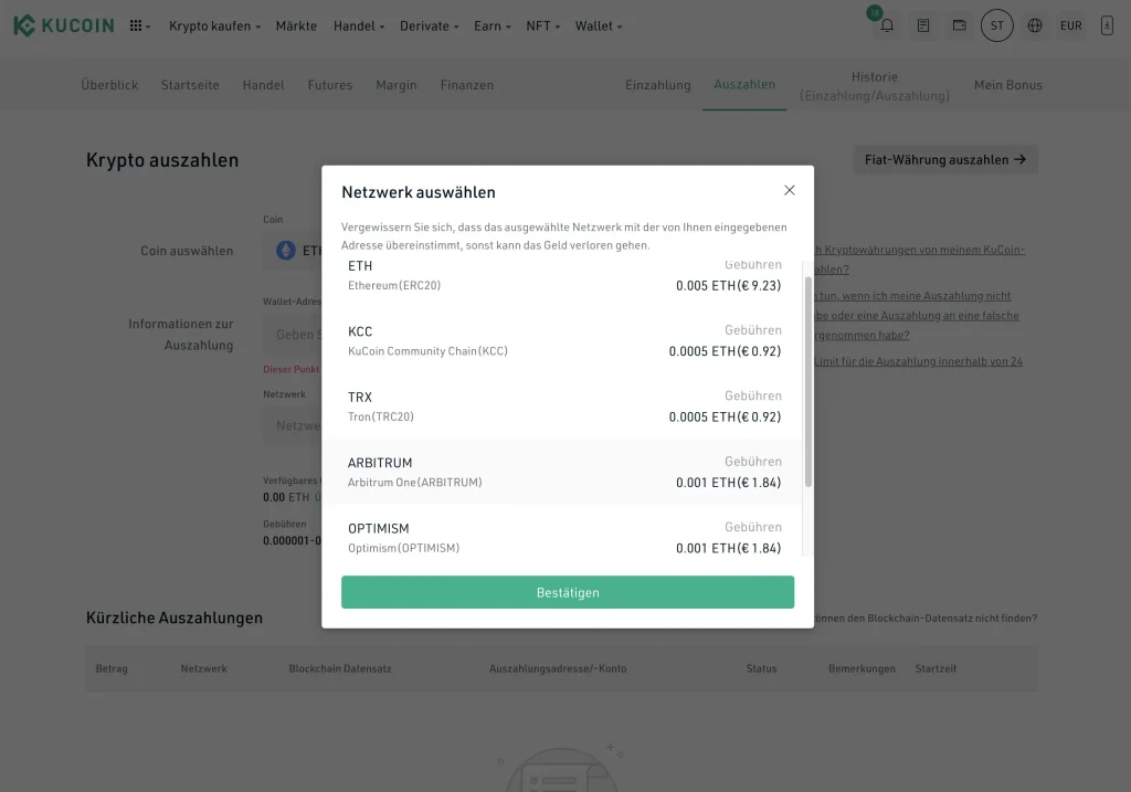 Außerdem bietet KuCoin die Möglichkeit, Kryptowährungen direkt einzuzahlen. Dazu bietet KuCoin die Möglichkeit Einzahlung über viele alternative Chains an, sofern die jeweilige Kryptowährung das unterstützt. Eine Besonderheit, die wir bei vielen anderen Krypto-Börsen noch vermissen. So kann beispielsweise Ethereum oder USDC über günstigere Layer-2 Lösungen wie Polygon oder Optimism ein- und ausgezahlt werden.