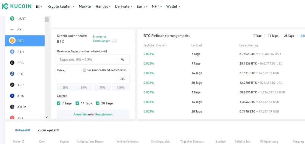 Für die Lending Funktion unterstützt KuCoin mehr als 100 Kryptowährungen. Nutzer von KuCoin haben hier die Möglichkeit, mit ihren Coins passiv Geld zu verdienen, indem sie diese verleihen. Die Höhe der erzielbaren Zinsen ist variabel und richtet sich u. a. nach der Nachfrage der jeweiligen Kryptowährung sowie der Laufzeit. Für den Kredit müssen Kreditnehmer Sicherheiten hinterlegen, dennoch ist auch das Krypto Lending nicht risikolos.