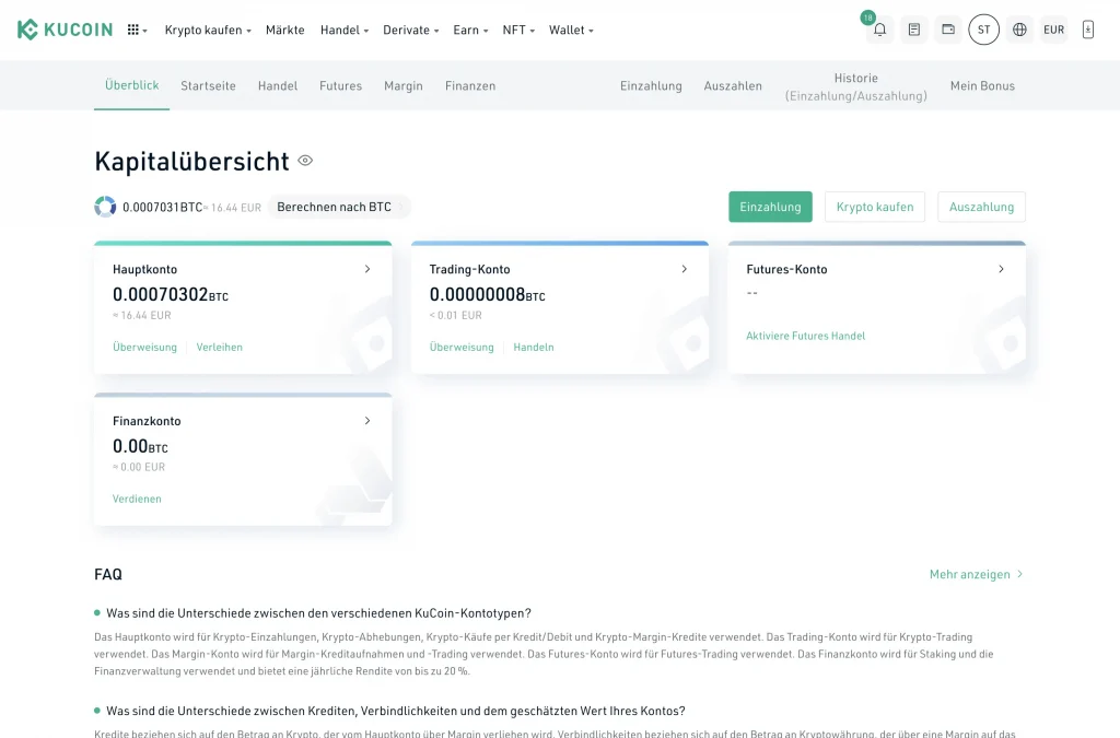 Das Hauptkonto verwaltet Kryptowährungen und Euro und dient sowohl für Ein- als auch Auszahlungen. Der Handel erfolgt über das Trading-Konto, wohin nach der Einzahlung das Kapital für den Kauf von Coins transferiert werden muss. Das Futures-Konto ist für den Handel mit Futures vorgesehen, während das Finanzkonto das Krypto-Lending und Staking über KuCoin Earn steuert.