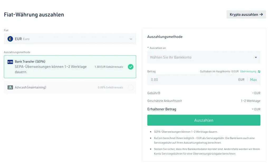 Dir stehen zwei Möglichkeiten zur Verfügung, um auf KuCoin Euro und andere Fiat-Währung einzuzahlen: SEPA-Banküberweisung und Kreditkarte. Die KuCoin Einzahlung per Girokonto kostet 0,70 € Gebühr je Überweisung. Entscheidest du dich hingegen für eine KuCoin Einzahlung per Kreditkarte (Visa/Mastercard), fällt eine Gebühr in Höhe von 3,8 % an. Wir empfehlen deshalb die Einzahlung per Kreditkarte möglichst zu vermeiden.