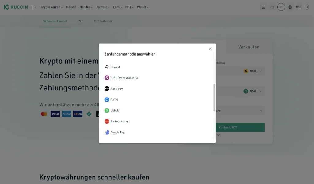 KuCoin erlaubt es seinen Nutzern auch, Kryptowährungen sofort zu kaufen, ohne vorher Geld per SEPA auf die Plattform einzahlen zu müssen. Hierfür stehen eine Reihe von direkten Zahlungsmöglichkeiten zur Verfügung. Insgesamt unterstützt KuCoin mehr als 70 unterschiedliche Zahlungsmethoden, welche auf der Plattform den drei Kategorien Fast Trade, P2P und Third-Party zugerechnet werden. Hierzu zählen u. a.: