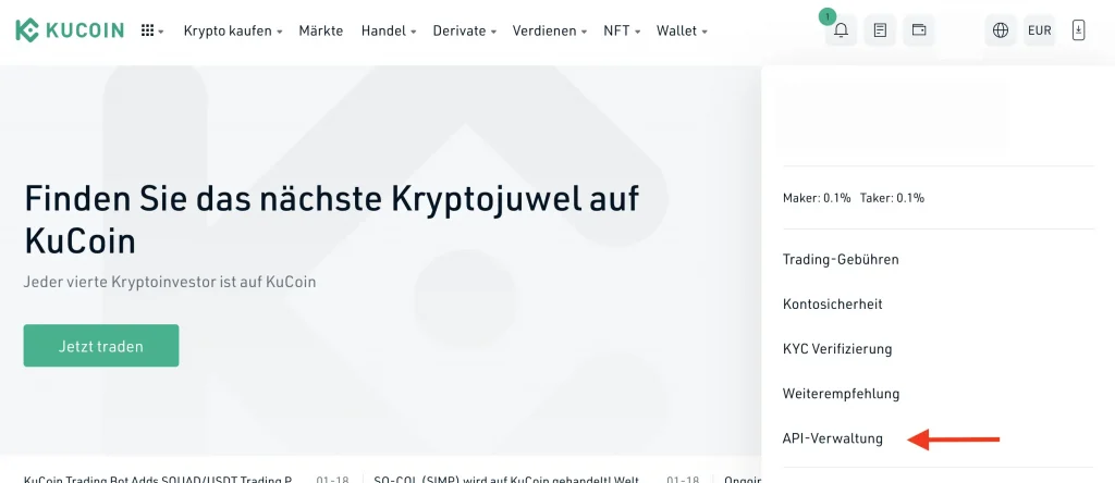 Schritt 1: In deinem KuCoin Account findest du unter deinem Profil > API Verwaltung die Möglichkeit, einen API Schlüssel zu erstellen.