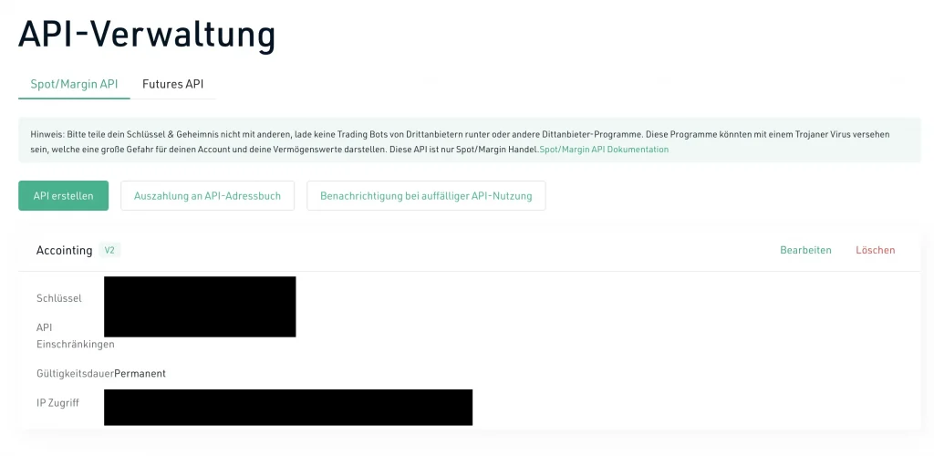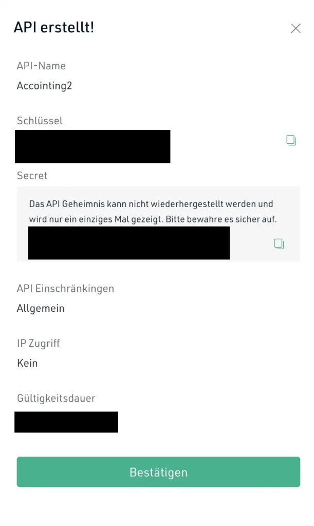 Schritt 5: Danach ist der API Schlüssel für KuCoin erstellt. Du kannst den API Schlüssel und das API Geheimnis jetzt in ein Krypto Steuer-Tool wie Cointracking importieren, um alle Transaktionen automatisch zu importieren.