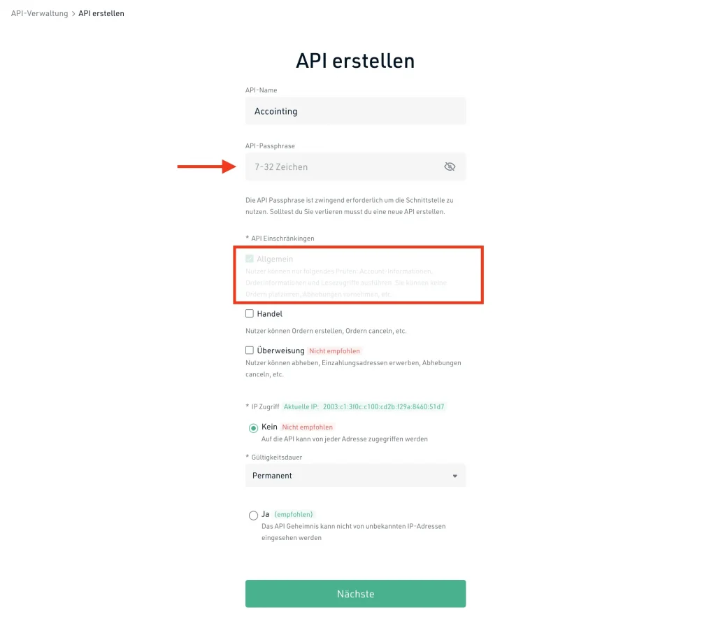 Schritt 3: Nun kann der API Schlüssel erstellt werden. Dazu kannst du einen beliebigen API-Namen und eine beliebige API-Passphrase vergeben. Handel und Überweisungsrechte sind für den Import in ein Krypto Steuer-Tool wie Cointracking nicht notwendig und sollten nicht aktiviert werden. Es reicht dann auch aus, die IP Einschränkung auf „Kein“ zustellen.