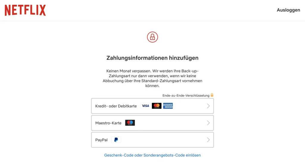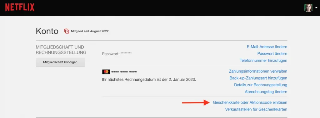 Den Netflix Gutschein einzulösen, ist ganz einfach. Gehe dazu in dein Netflix Konto unter “Geschenkkarte oder Aktionscode einlösen” eingeben. Der Gutscheinwert wird nach Eingabe automatisch deinem Konto gutgeschrieben und die nächste Abbuchung erfolgt von deinem Netflix Guthaben.