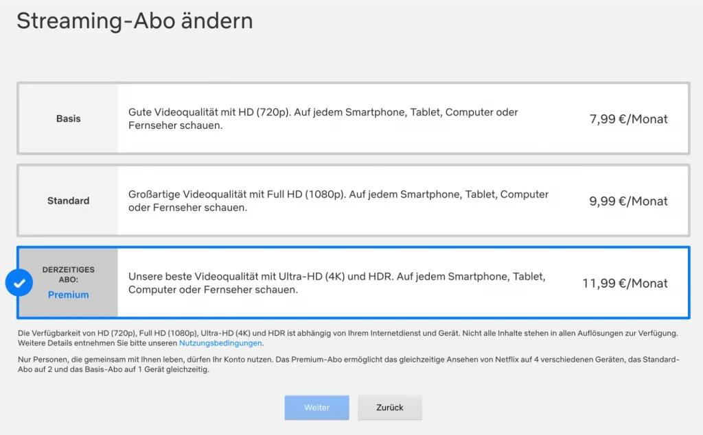 Netflix hat aktuell 4 Abo-Varianten im Angebot: