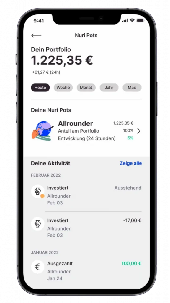 2015 unter dem Namen „Bitwala“ gegründet und seit 2021 als „Nuri“ weitergeführt, will das Berliner Fintech-Unternehmen es nun mit den Großen (N26 oder Trade Republic) der Branche aufnehmen. So kannst du bei Nuri nicht bloß ein kostenloses Girokonto führen und Kryptowährungen kaufen, sondern mit den neu eingeführten „Nuri Pots“ auch in ETFs investieren.