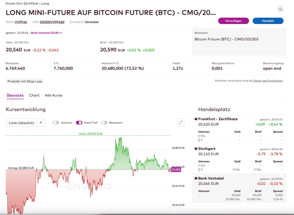 Onvista bot bislang kein Angebot zum Kauf von echten Kryptowährungen an. Die bisher einzige Möglichkeit, über Onvista an der Wertentwicklung von Kryptowährungen zu partizipieren, ist der Kauf von Krypto-ETPs und Zertifikaten wie Knock-out Zertifikate.