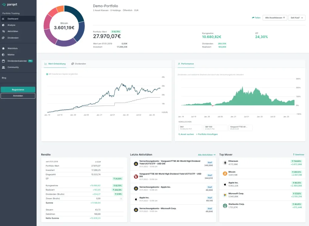 Parqet (ehemals Tresor One) ist eine sichere und vertrauenswürdige Möglichkeit, das eigene Portfolio zu verfolgen und bietet umfangreiche Analysefunktionen, um den Anlageerfolg zu verbessern.