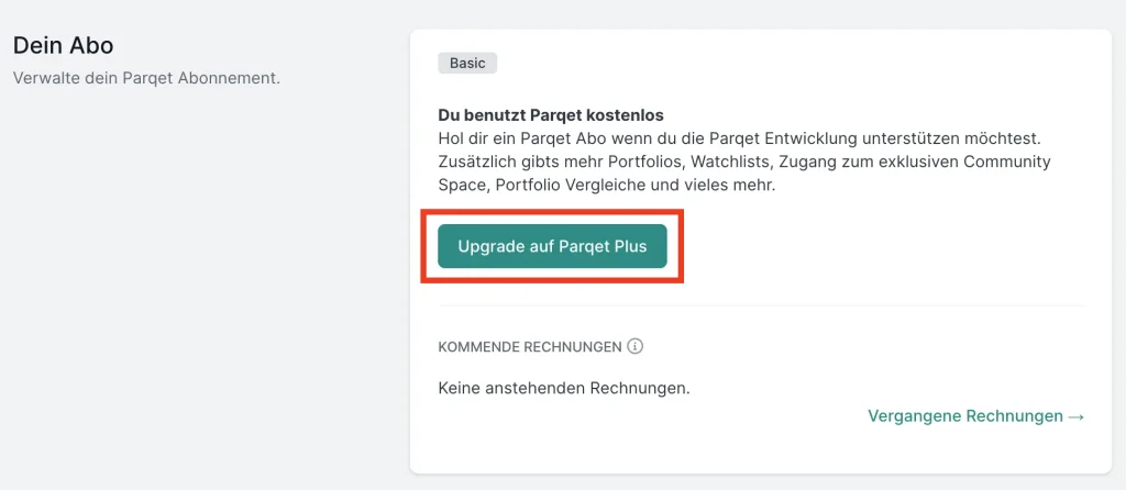 Schritt 2: Klicke in den Einstellungen auf „Upgrade auf Parqet Plus“.
